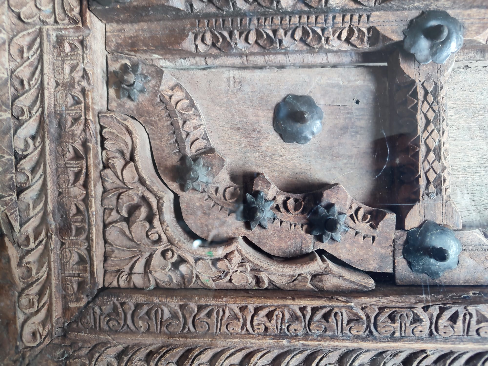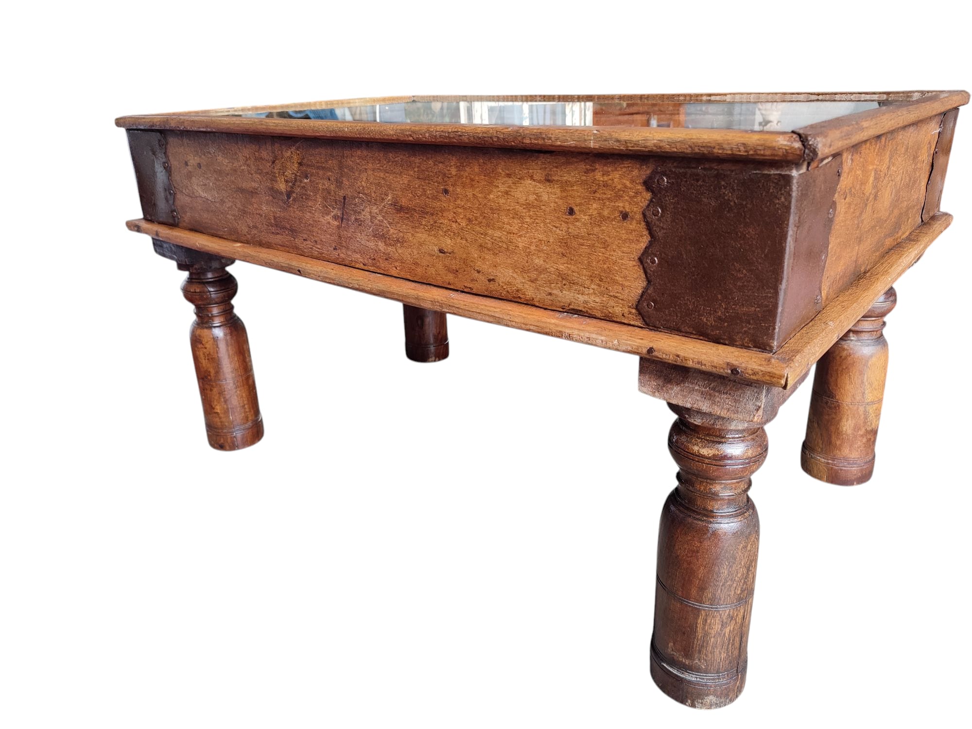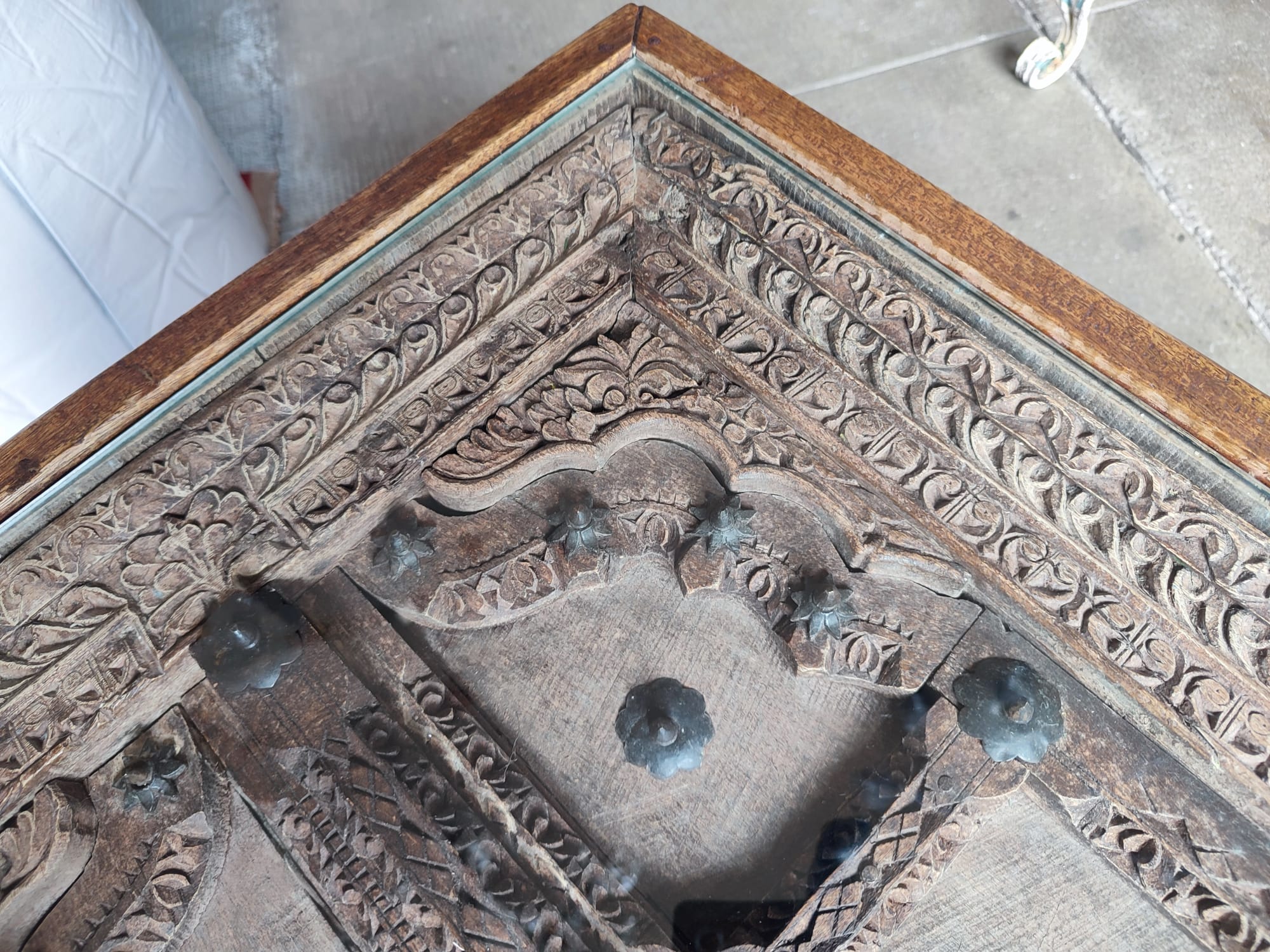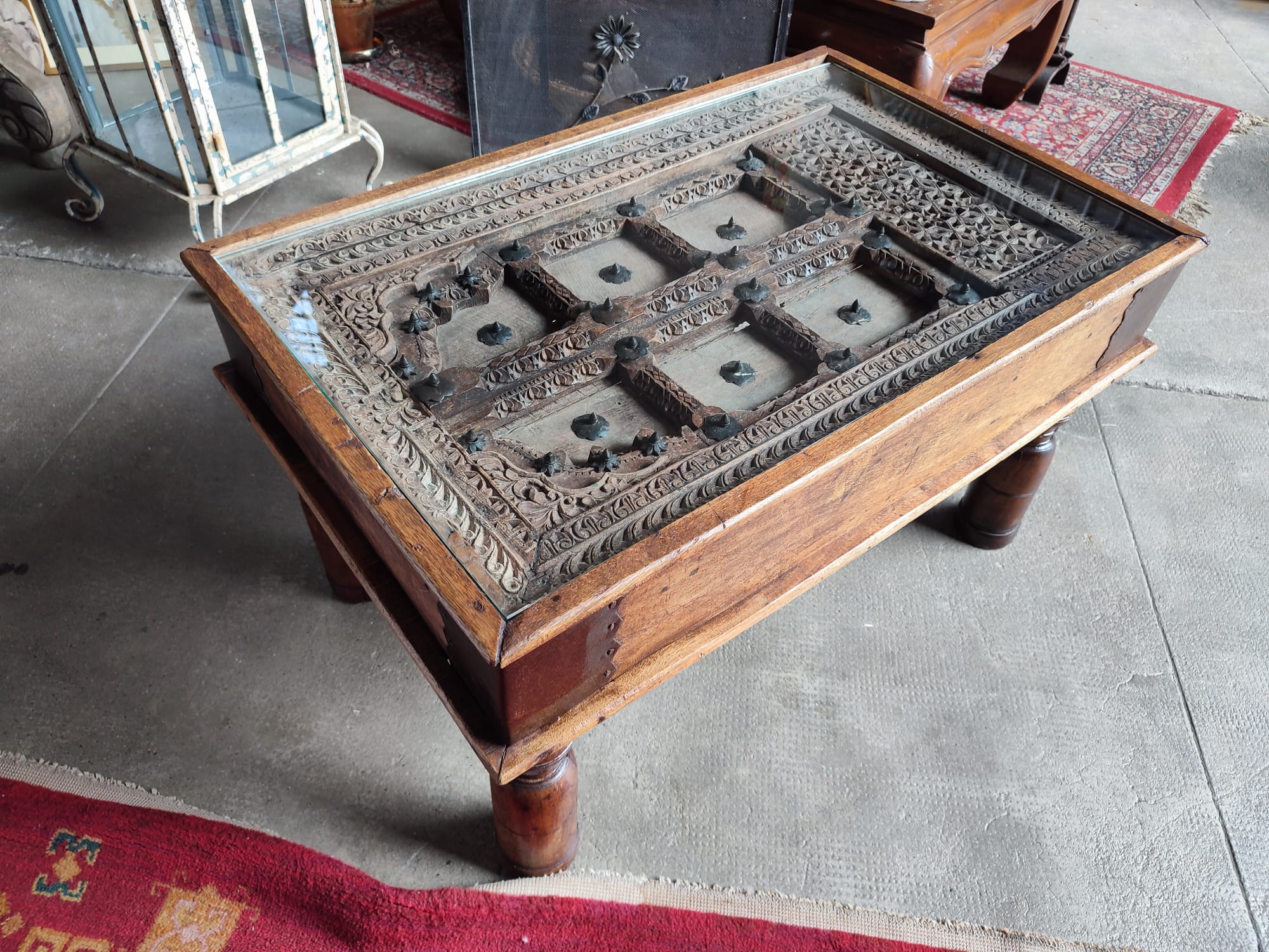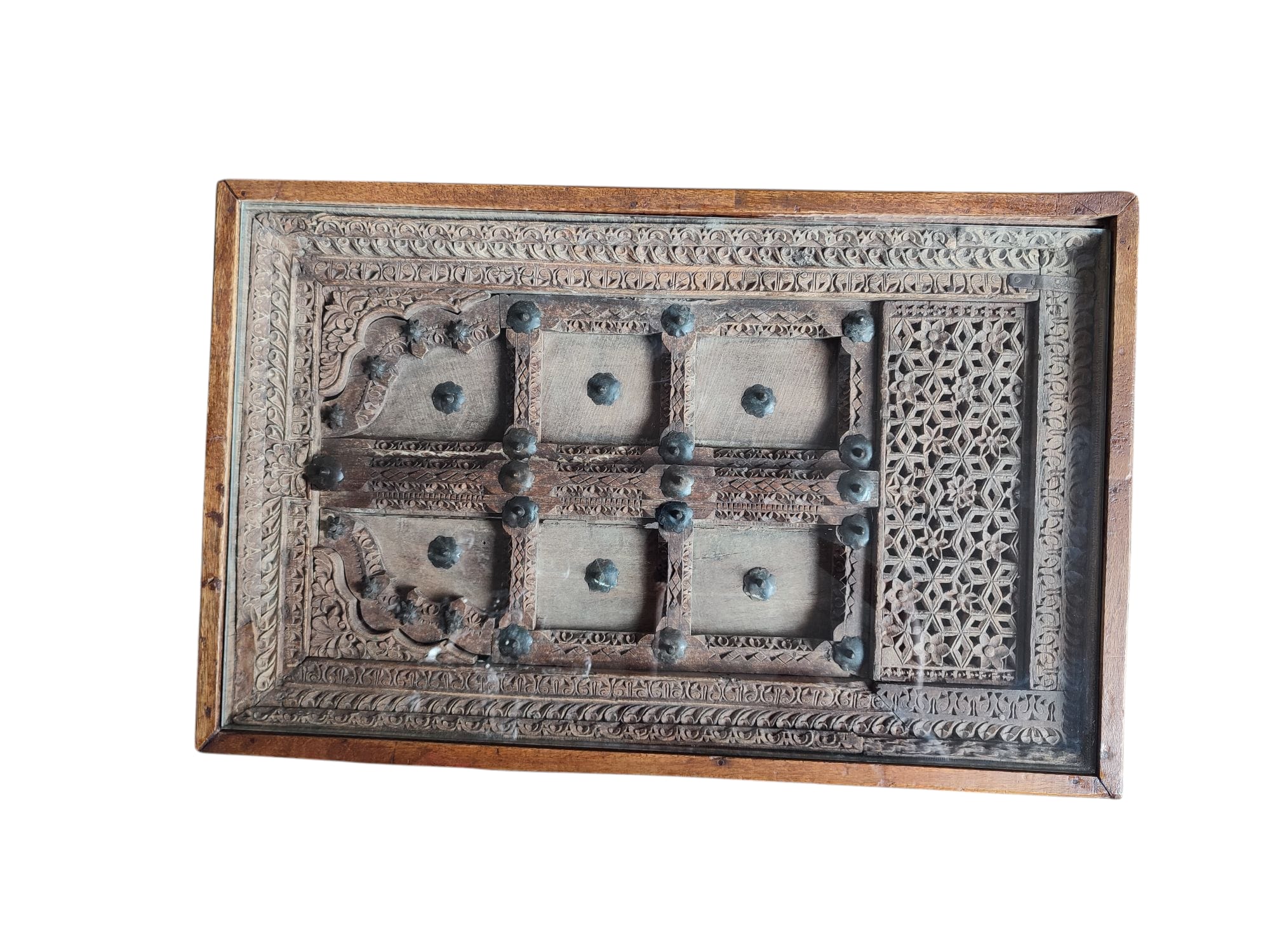 TAVOLINO PAKISTANO ANTICO FATTO CON FINESTRA ANTICA E PIANO IN VETRO